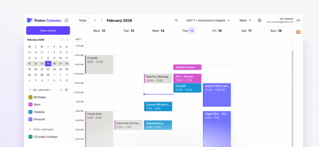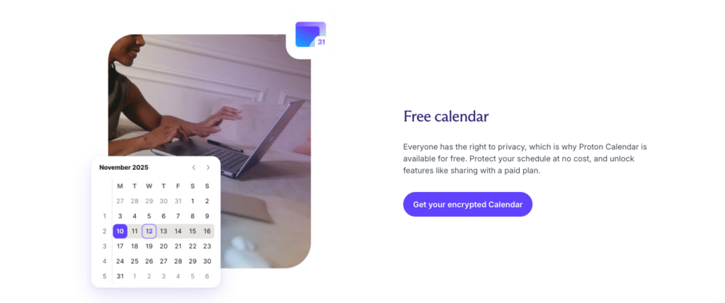 Proton Calendar er en kalenderapp med fokus på privatliv og sikkerhed. Alting i begivenhederne – Titel, beskrivelser og deltagere – Er krypteret end-to-end, så kun brugeren kan se indholdet. Ikke engang Proton har adgang.