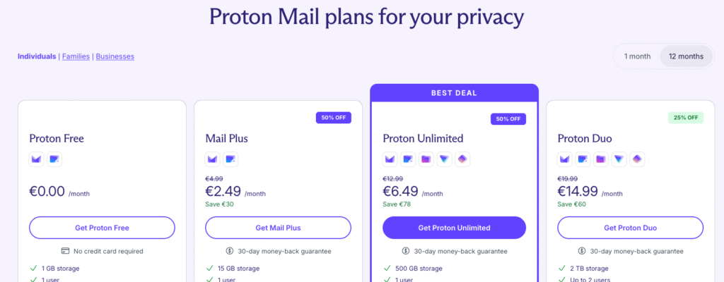 Den største pakke, Proton Unlimited, ligger omkring 1.400 DKK om året ved kvartalsvis betaling, omregnet fra CHF eller EUR. Her følger kalenderen med alle muligheder, ekstra lagerplads i Drive og fulde mailfunktioner. Teams- Og Business-planer er målrettet flere brugere og egne domæner. Kalenderen er inkluderet som en del af pakken og understøtter samarbejde.