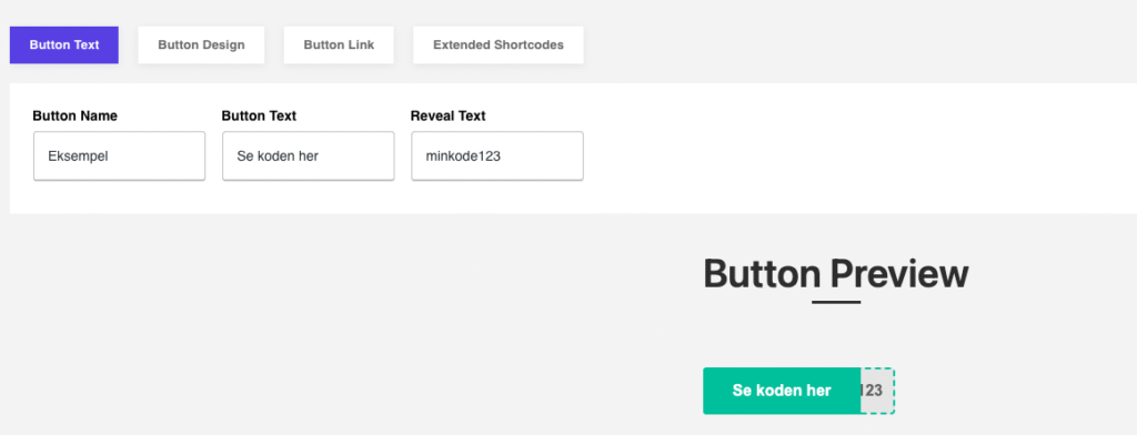 3. Udfyld felterne. Skriv selve knapteksten i “Button text”, læg kuponkoden eller andet skjult indhold i “Reveal text”, og indsæt dit affiliate- eller destinationslink i “Link”.