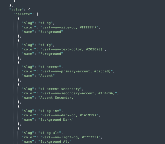 - Start med at definere design-tokens i settings i theme.json. Navngiv palette, fontFamilies, fontSizes og spacing konsekvent. Både slug og navn skal være tydelige og genkendelige, så farver og størrelser er nemme at finde og bruge på tværs af sitet.