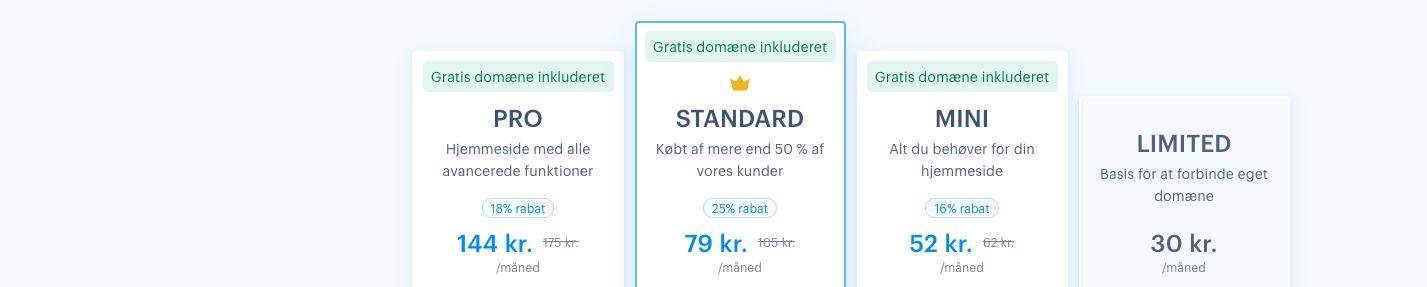 Det giver mening at vælge plan ud fra formål. En webshop har brug for Standard eller Pro pga. betalingsløsninger og produktstyring. En portfolio klarer sig ofte med Basic. Lagerpladsen svinger meget mellem planerne, så websites med mange billeder eller videoer skal vælge derefter.